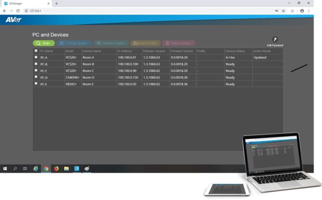 Phần mềm AVer EZManager được cài đặt trên PC Windows hoặc iOS của bạn, nhưng nó không dừng ở đó. Bạn có thể quản lý và điều khiển linh hoạt các thiết bị USB AVer thông qua bất kỳ máy tính bảng nào chỉ bằng cách mở EZManager trong trình duyệt Chrome và nhập địa chỉ IP của PC trung tâm. AVer EZManager cũng có giao diện người dùng trực quan hiển thị tên thiết bị, địa chỉ, kiểu máy, phiên bản, software và trạng thái thiết bị, để giúp bạn tối ưu hóa việc quản lý và vận hành thiết bị.
