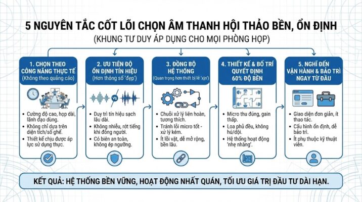 Nếu phải cô đọng toàn bộ kinh nghiệm triển khai âm thanh hội thảo thành một khung tư duy có thể áp dụng cho mọi phòng họp, thì đó chính là 5 nguyên tắc dưới đây. Không nguyên tắc nào nói về “hãng nào tốt nhất”, bởi trên thực tế, bền hay không nằm ở cách chọn và cách ghép, chứ không nằm ở logo trên thiết bị.