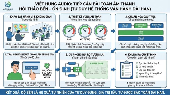 Đây chính là nền tảng tư duy mà các đơn vị làm âm thanh hội thảo chuyên sâu, trong đó có Việt Hưng Audio, luôn đặt lên hàng đầu trước khi nói đến bất kỳ thiết bị hay cấu hình cụ thể nào.