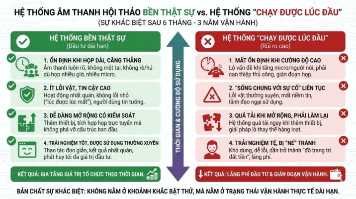 Chính khả năng vận hành lâu dài, ít phụ thuộc con người, mới là yếu tố quyết định giá trị đầu tư thực sự của âm thanh hội thảo.