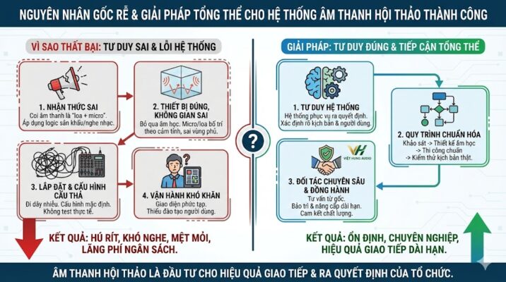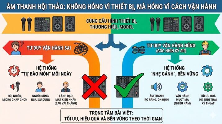 Âm thanh hội thảo không hỏng vì thiết bị, mà hỏng vì cách vận hành Trong thực tế triển khai hàng trăm phòng họp, một nghịch lý xuất hiện lặp đi lặp lại: cùng một cấu hình thiết bị, cùng thương hiệu, cùng model, nhưng có phòng họp vận hành